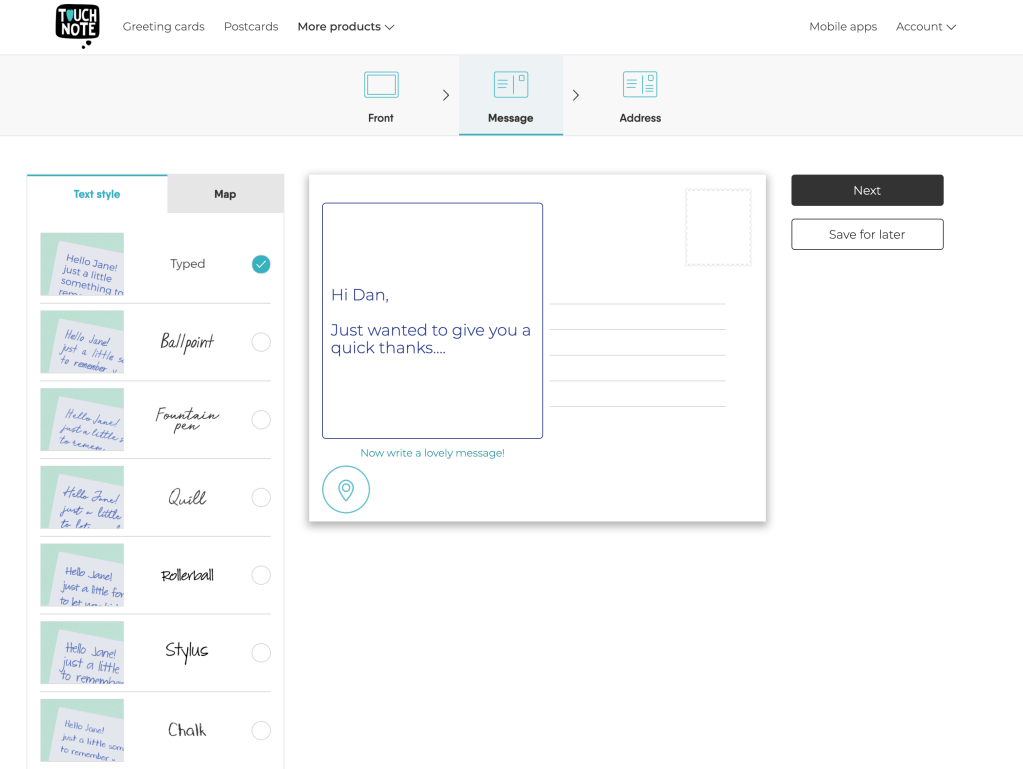 Touchnote runs on your computer, your tablet, your smartphone.  Create an account, log on, start a postcard (the simplest), choose the image you want for the front, type a note on the back, and you’re ready to go! You can pay as you go or buy a package of credits. A postcard is 1 credit, about $3 (though less if you buy several at once.)
