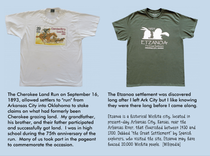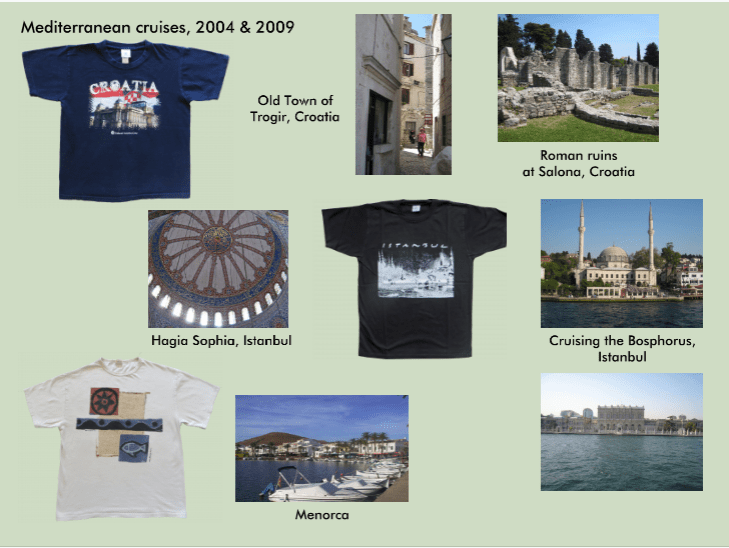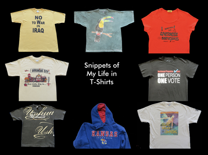Cleaning out some closet shelves resulted in a pile of too many t-shirts. The obvious answer was to get rid of them — but they held so many memories. Aha, a chance to do some photocrafting: take photos of the t-shirts, make a book, and get rid of the actual t-shirts. I had a coupon for a Collage.com book so that was added incentive to create a book. I could remember my t-shirts without having to store them.