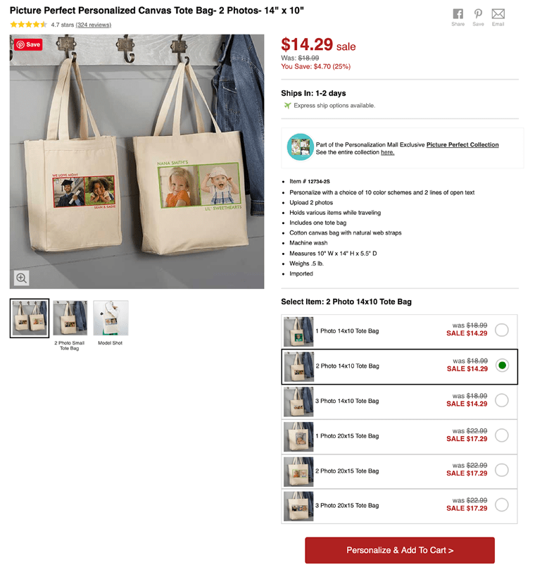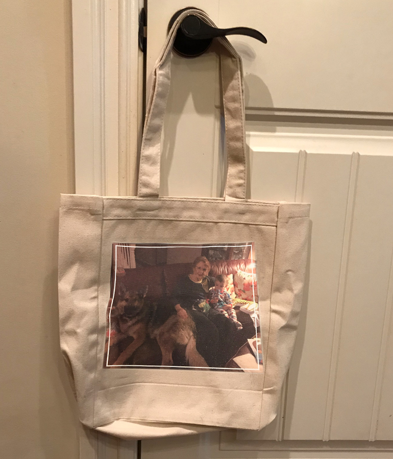 My sister used Personalization Mall and chose “1 Photo 14×10 Tote Bag”. If you have more photos you want to use, you can choose 2 or 3 photos. There’s also a larger tote bag, 20″x15″. Another option is to add a few words of text above and below the photos. Personalization Mall offers an option to use nine photos in a 3×3 grid as well.