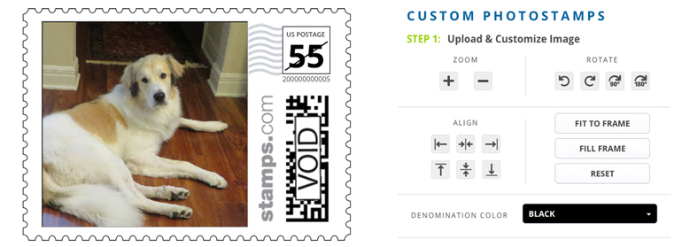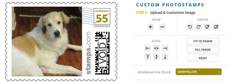 When you click on the green Get Started button, you will be able to upload your photo. You then have the opportunity to make some changes to the size and rotation. The + and – buttons zoom the picture in or out. The “black” button offers additional color options for the postage number. Using Caesar’s photo from our earlier photo sock design, we first uploaded the original photo and then zoomed in to highlight his face. We also changed the color of the postage rate text.