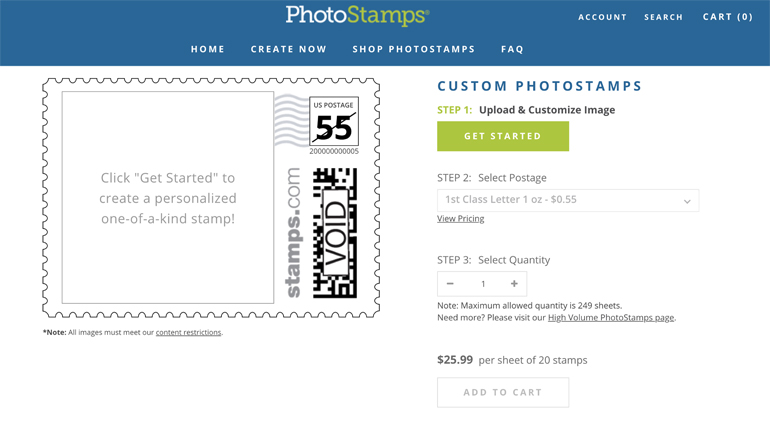 There are several choices for which postage stamp value you purchase (though Forever Stamps are not available.) Select the postage stamp rate and how many sheets (20 stamps/sheet.) Add to your cart and you’re ready to go! The current PhotoStamp cost is $25.99 per sheet of 20 stamps but the price per sheet decreases if you order more than one. (At $0.55/stamp, a regular 20-stamp sheet would be $11.00.)