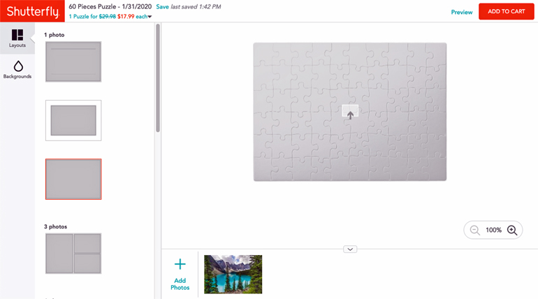 I often find good offers on Groupon for photocrafting projects. I found a $5 coupon for “One 11×8″ Customizable Photo Puzzle” and decided to try it. (Note: Groupon coupons almost always have an expiration date and a charge for shipping that may be more than the cost of the product!)