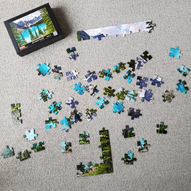 The coupon was for Printerpix.com. I uploaded two pictures I’d taken in a forest where a friend and I like to hike. She keeps a jigsaw puzzle going all the time so I didn’t want it to be too easy. I tried to pick two of my pictures that each had lots of similar detail throughout the picture.