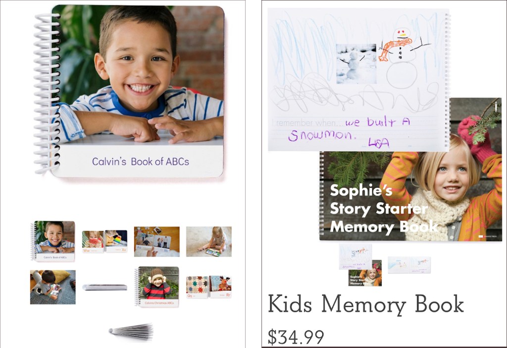 Three of the choices particularly interested her: a personalized ABC Board Book, a Memory Book, or a personalized Face Photo Sticker Book. The first is especially good for young learners. For example, they can learn the alphabeet from their favorite things like foods, toys, clothes and more. Just upload your favorite photos and add text in a large, easy-to-read type. The second features a favorite photo on each page with space around it for your child to draw and/or write their memories.