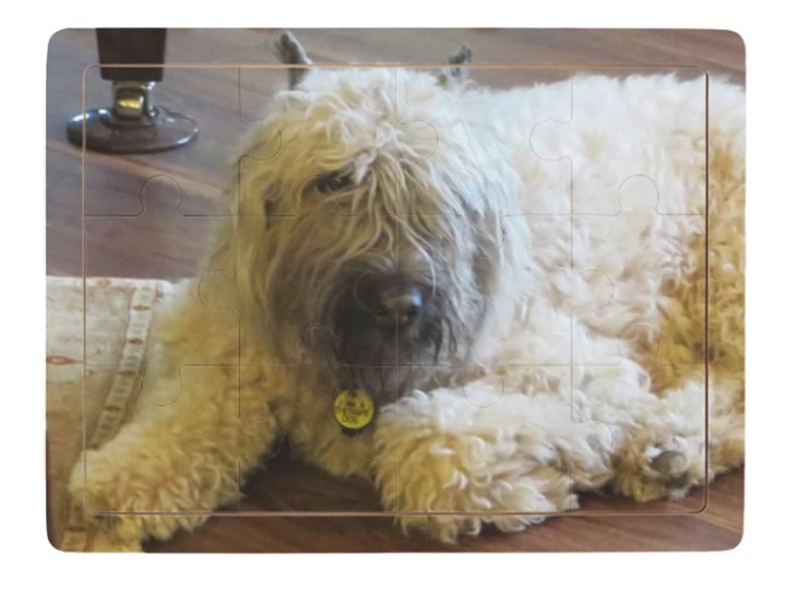 Shutterfly has a jigsaw puzzle just for toddlers with 12 thick wooden pieces in a wooden tray. The puzzle with tray is about 12″x9″. With photocrafting, you can personalize the puzzle for your child: a fun picture of themselves or a family member, a favorite pet, or even a drawing they made. To the left is a puzzle with Charlie, a very well-loved pet. You can see the outline of the pieces; the photo extends onto the tray.