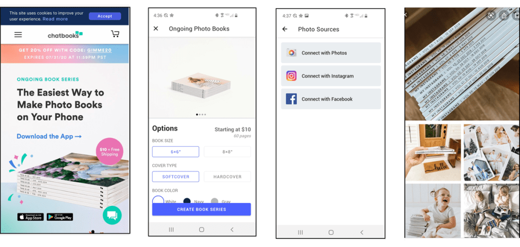 The Ongoing Photo Book Series is especially great for the busy photocrafter. It’s a subscription service that automatically creates a photo book for every 60 new photos uploaded to a specified source: Facebook, Instagram, or Camera Roll. You pay just $10 for each softcover album (or $15 for hardcover). Photos appear in chronological order. Nothing actually gets ordered until you press the ORDER button so you can add captions, do some editing, change the book title, and more. You can cancel anytime.