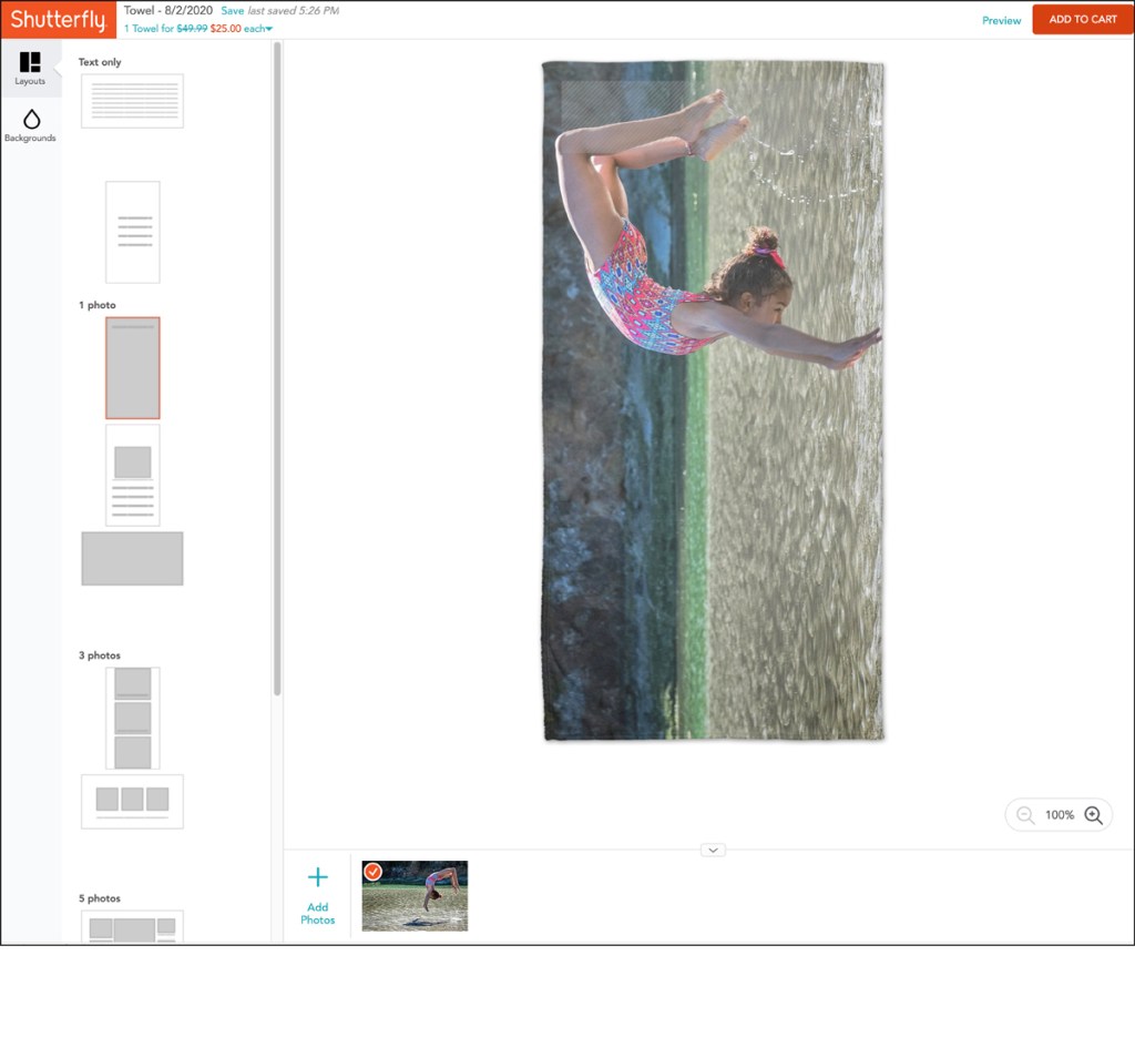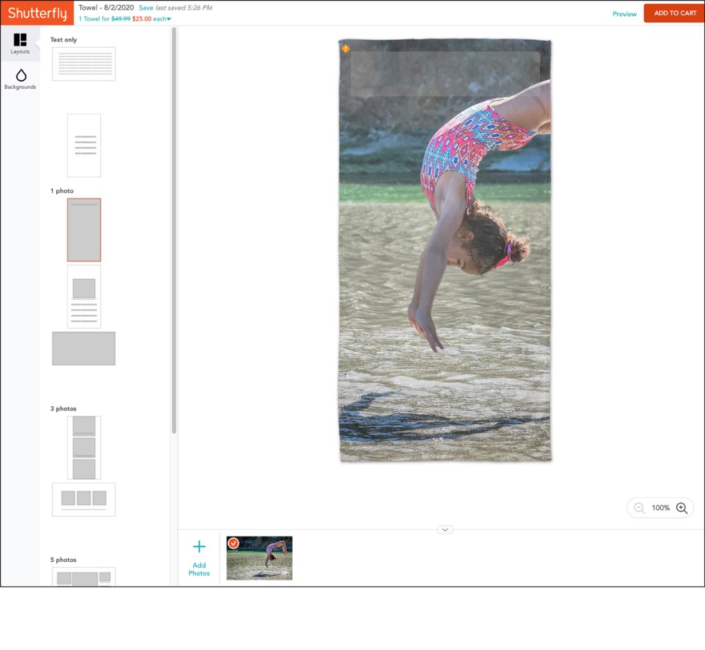 For my gift towel, I thought I wanted to use two photos and make a note about this being the covid-19 summer. Shutterfly provides text boxes in almost all layouts but I wanted larger text. I created a text image and uploaded it as the third photo. I tried the layout both in portrait and landscape modes. Finally I decided one full picture would look the best so I created that in portrait mode and added text in the provided text box. I still wasn’t totally happy so I edited the image itself (using Adobe Photoshop Elements) and added text where I wanted it. I tried it in landscape mode and in portrait mode. The preview towel on the right below is the final choice.