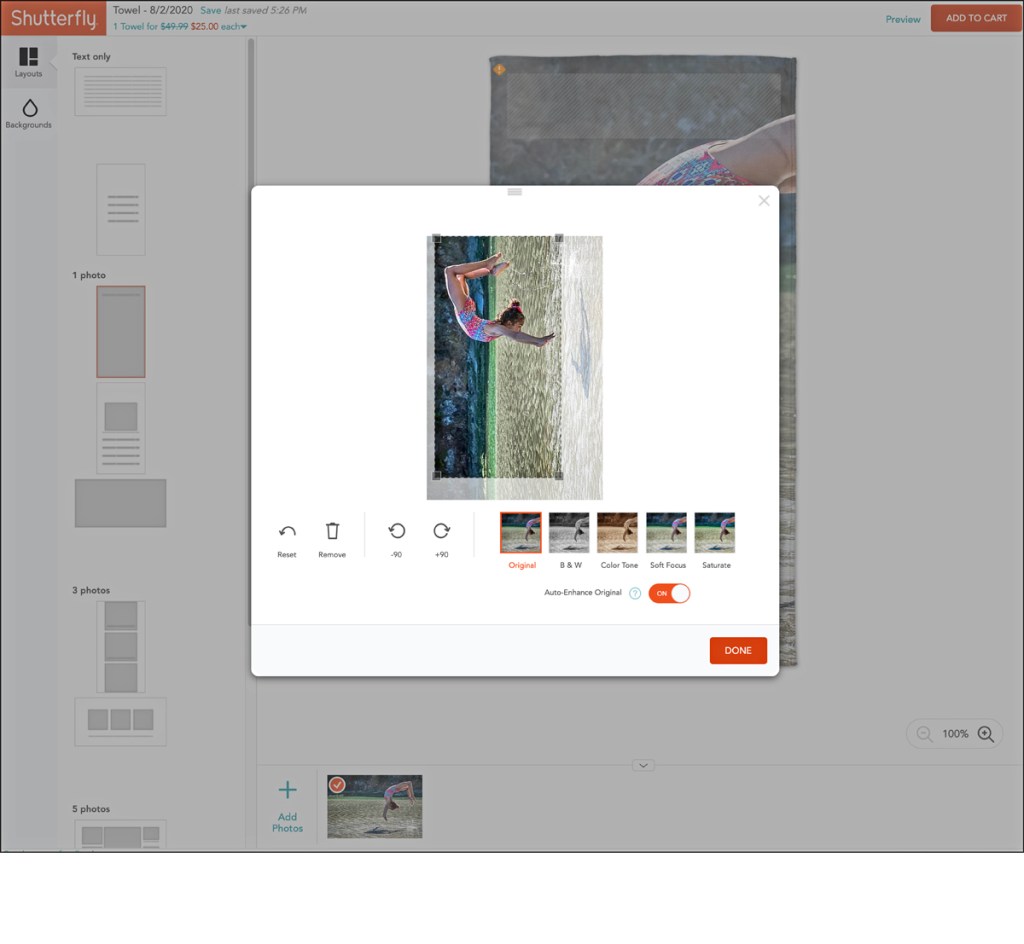 Almost all the photocrafting sites offer beach towels. Some are as large as 70″ x 35″, others are 60″x30″. Most have a polyester front (with the image) and a cotton backing. Walmart offers two sizes, 72″x36″ and 60’x30″. In addition to rectangles, the Personalization Mall has a cute round towel. Even one of the Etsy shops has a photo towel (but note that you don’t do it yourself; you send your photo in via email.) I chose to use Shutterfly because I know it’s a reliable site and they had a sale so the cost was less! Also, the towel size of 60″x30″ seemed good for me, particularly as I was making it for a 3-4 year old.