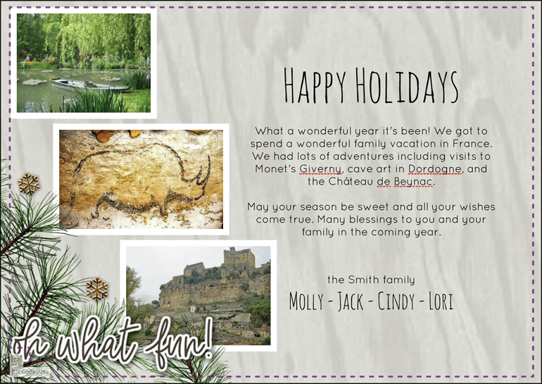 Almost every site that does any kind of photocrafting has cards and most likely has lots of holiday card templates. If there’s already a site you use frequently, I encourage you to stick with it! You already know all the ins and outs of using their particular features and avoiding their unique foibles. I will use three sites for examples today (Shutterfly, Zazzle, and Heritage Makers). If you don’t have a favorite site, consider these plus those on Tom’s Guide: Best Photo Cards. All of my three sites include lots of interesting template designs, offer an option for a custom design of your own, allow at least eight or more photos, and provide space for text as well as images.