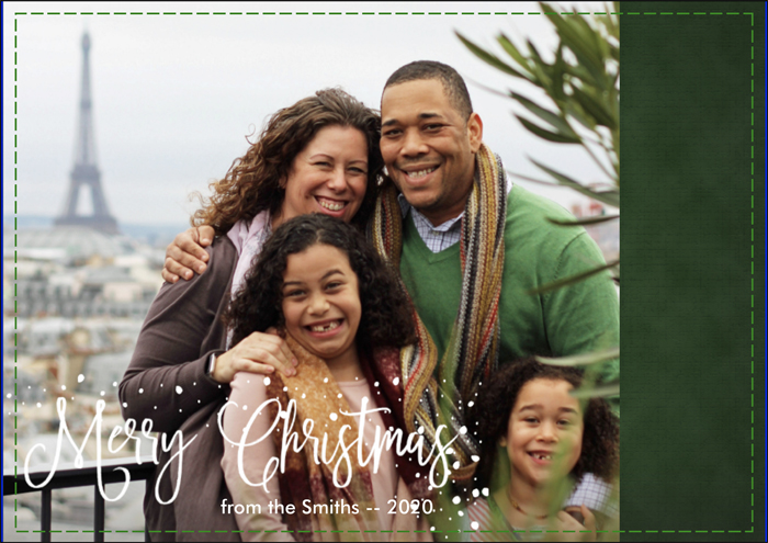 On Zazzle, I chose a landscape template but my family photo was really a vertical image. I added a green background, expanded the snow image in the template from around the text to the edges, centered the image, and changed the text to “Happy Holidays”. For the back, I added the three other images and my greeting text.