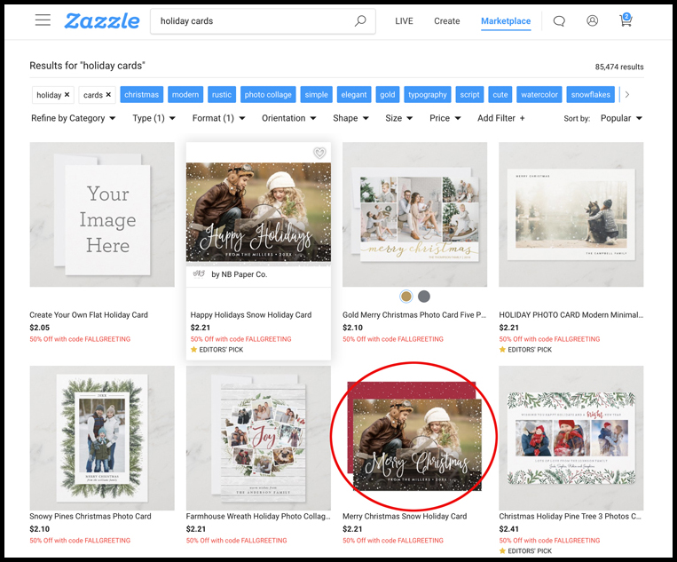 It can be difficult to choose a template from the large number available (hundreds!) Even after you’ve chosen, both Zazzle and Heritage Makers offer a lot of flexibility in editing a template (rearranging the photo placement and size, adding additional images, and including text areas). Heritage Makers also includes a large collection of art elements (e.g. clip art) that are included in the templates but can be rearranged, deleted, or replaced as you wish. There’s no problem in ensuring that your card is unique! I chose a 5″x7″ flat card template from each site to use for example holiday cards.