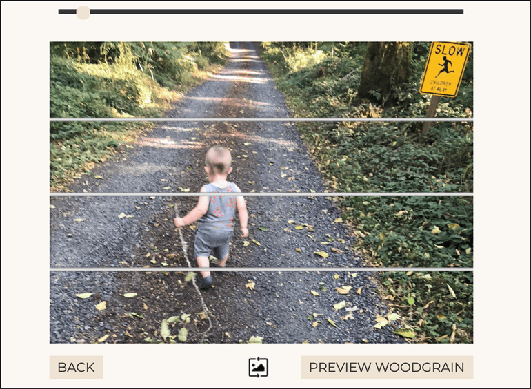 Although this is an easy photocrafting project, there are a couple considerations with the pallet. It has lines running through your image! Most likely when you up load your photo, it won’t fit neatly into the divisions. That’s easy to fix. You can resize the image to make it larger (or smaller), rotate the image, and move it within the pallet area. In my case, I uploaded a portrait mode photo that was obviously too tall for the landscape pallet. The default placement took the top part of the original image. I always like to highlight the person so I tried making the child larger. However, that moved the CHILDREN AT PLAY sign out of the picture. I moved the image around and made it smaller (though not as small as originally.
