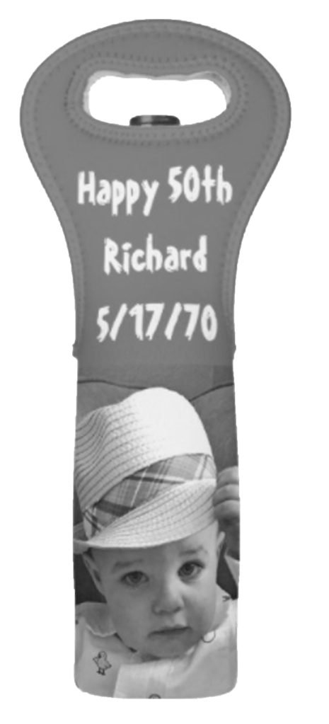 So have some fun! Using existing images or clip art, your gifts can be more personal. Want to impress your KU alum uncle? Need a wedding shower gift for your friends, Rod and Maya? How about a cute piece of clip art for your Christmas wine gift? What about a 50th birthday? (I found a picture of my friend, Rich, when he was a baby.) Note that Zazzle previews can show you the tote flat as with the KU tote or with a bottle inside as the other three below. There are also many different designs available on Zazzle (but that misses the fun of photocrafting and personalizing!)