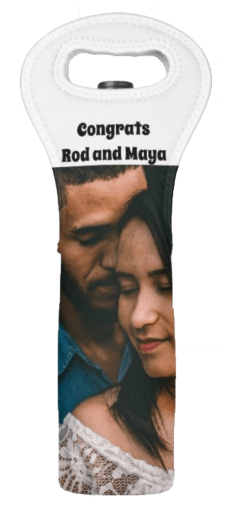 The dimensions of the tote are 6.5″w x 15.5″l x 0.31″h, just right for a 750ml-1 liter bottle. They are made of Neoprene that keeps your bottle cool and safe. Great as a standalone gift and even better when paired with a nice bottle of wine! These wine totes can be printed edge to edge in full color for fully custom designs that will stand out. The tote stores flat. Tip from Zazzle: To ensure the highest quality print, please note this product’s customizable design area measures 6″ x 15″. For best results please add 1/5″ bleed.