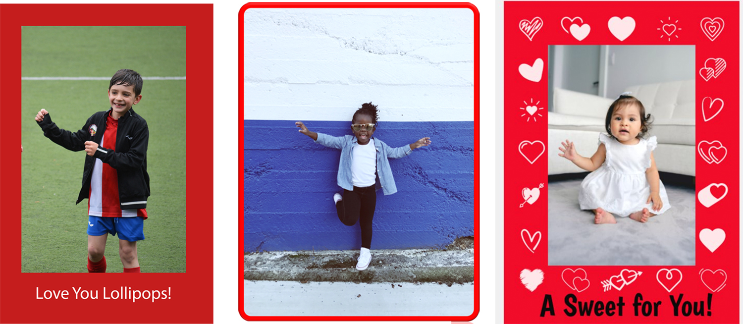 These cute cards are fairly simple. All you do is have your child pose like they are handing something to you. Upload the photo to your computer or do it from your phone. Add HAPPY VALENTINE’S to the photo and print them out at home or through a printing service (in town or online). Then you just poke the lollipop through where the hand is. It looks like the person is handing you the lollipop.