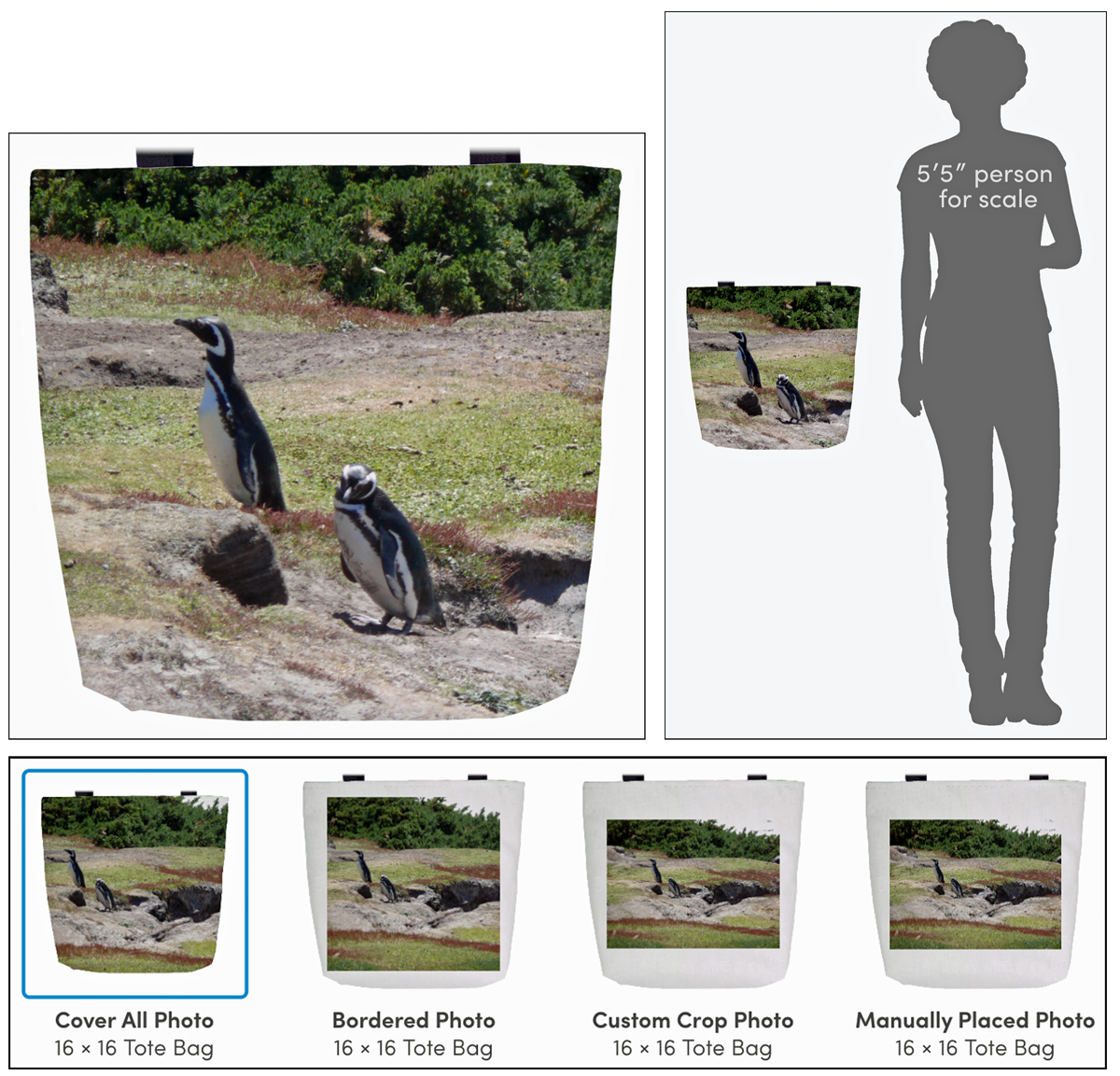 Anyone can use a tote and what’s more fun than one that’s a reminder of a special vacation? This time we used collage.com because they allow a photo to cover the entire side of the tote. (Note that you can choose other layout options.). Mom loved the penguins in the Falkland Islands on a cruise of a lifetime. I zoomed in so that the penguins were featured front and center!