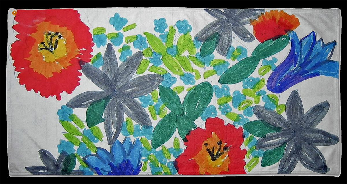 I still favor a single large image on the towel. I can never resist using a child’s drawing that deserves more than a place on the refrigerator or bulletin board. What a great way to be reminded of how talented and darling your children can be! A collage of family photos would be fun too!