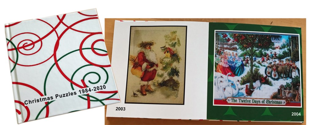My goal was to memorialize the Christmas jigsaw puzzle collection that we displayed every Christmas. My husband had begun the jigsaw puzzle tradition with our two children in 1984. I used puzzle-saver or Mod Podge glue to paint the faces of the puzzles so they could be hung as pictures during the holidays. But 36+ years later, storing them is a burden and it is time to let them go. A special book will allow us to hang on to the memories.