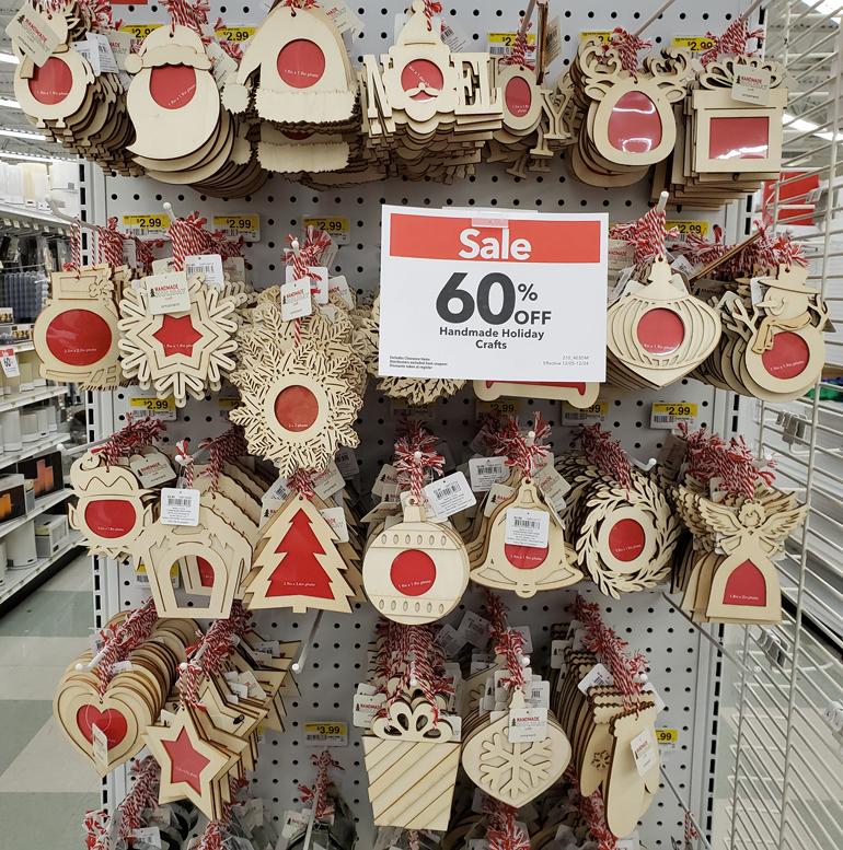 How about a photo ornament? You’ll need a printed picture that has an area about 1.5″ by 2″ that you want to display. Head to your nearest crafts store and pick up some DIY unfinished wooden photo ornaments and decorating supplies. Joann has lots of wooden frame options and they are probably on sale now. (You can also order them from Oriental Trading but that will take a few days at least.) Be sure to buy some glue, decorations, and paints as well.