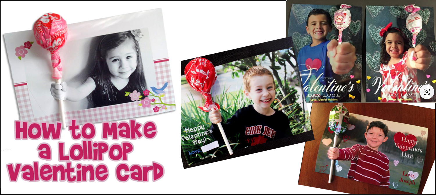 These cute cards are fairly simple. All you do is have your child pose like they are handing something to you. Upload the photo to your computer or do it from your phone. Add HAPPY VALENTINE’S to the photo and print them out at home or through a printing service (in town or online). Then you just poke the lollipop through  where the hand is. It looks like the person is handing you the lollipop.